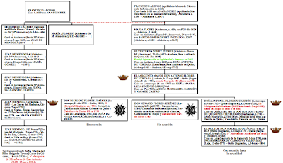 Permítasenos, por otra parte, explicar un poco más por qué motivo esta "María", supuestamente apellidada Flores, de 1601 no podía ser la antepasada de los Marqueses de Miraflores de Quito. Veamos en el árbol genealógico que les muestro ciertos parentescos que Silvestre Sánchez Flores estableció en una información "ad perpetuam rei memoriam" sobre su naturaleza (y la de sus padres y abuelos), "legitimidad y limpieza de sangre" ante la Justicia ordinaria de la villa de Alcántara, en 1669, cuando contaba apenas 15 años de edad y se disponía a pasar a América. No creemos que fuera persona de fortuna ni particularmente influyente en la Alcántara de esos años. Nos inclinamos a pensar, por tanto, que los parentescos que alegó, muy modestos todos, por cierto, desde el punto de vista nobiliario, eran verdaderos. Se limitaban a expresar que su madre, la verdadera María Flores, era prima hermana de Catalina Gómez Lobato, esposa de Juan Villapadierna, Notario del Santo Oficio de Alcántara, y que su padre Bartolomé Sánchez "Votalosajos" era tío carnal del Licenciado Juan Martín Periáñez, Presbítero y también Notario del Santo Oficio de la Inquisición en Alcántara. Tan sólo esos dos parentescos colaterales. No podía alegar nada más.