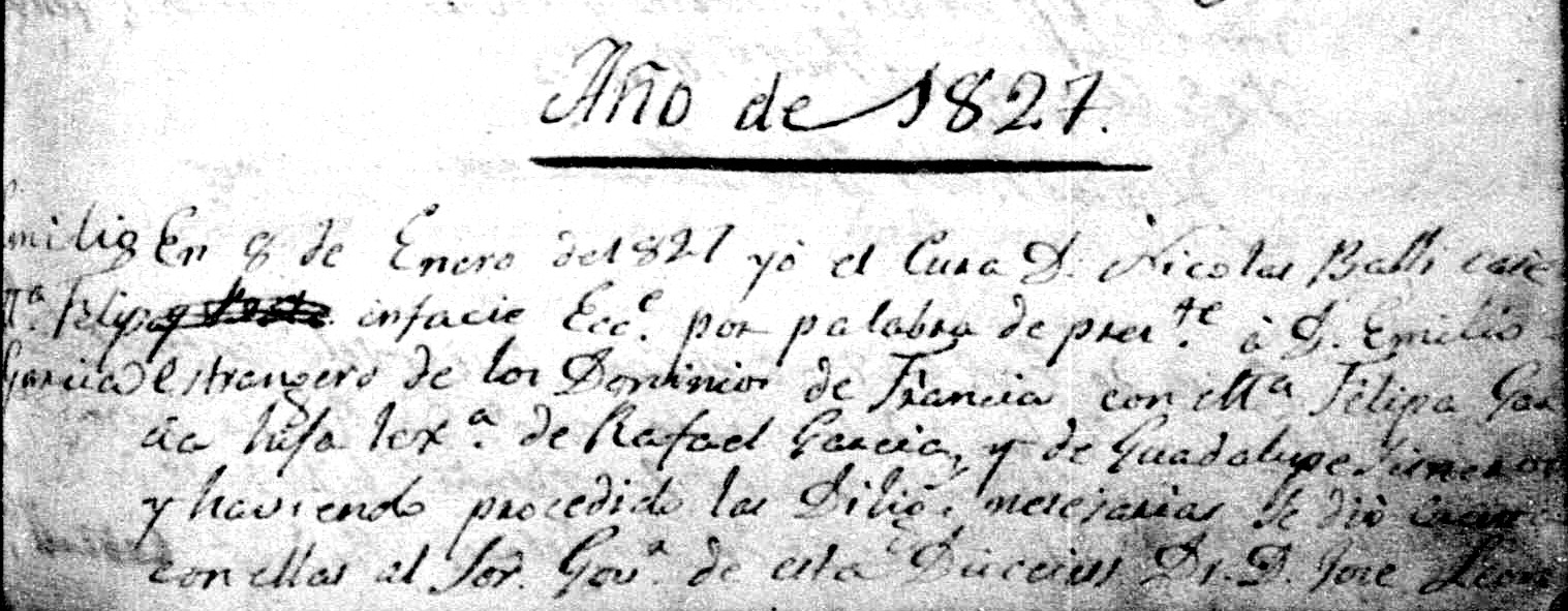 En 8 de Enero de 1827, yó el Cura D. Nicolas Balli casé infacie Ecce. por palabra de presente a D. Emilio estrangero de los Dominios de Francia con Ma. Felipa Garcia hija lexa. de Rafael Garcia, y de Guadalupe Sisneros y haviendo procedido las Diligencias necesarias